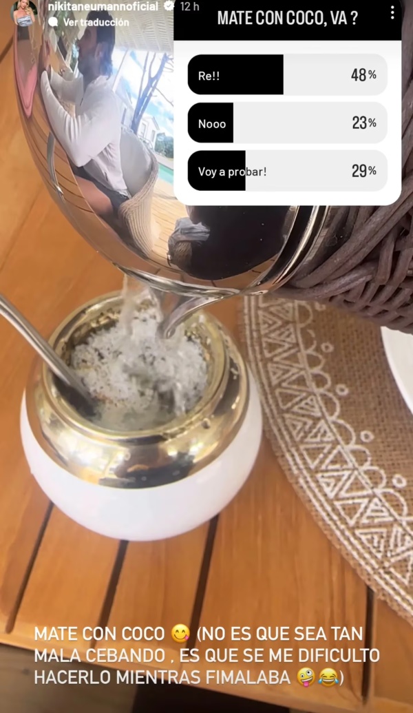 “No es que sea tan mala cebando, es que se me dificultó hacerlo mientras filmaba”, aclaró Nicole porque se le cayó agua mientras la colocaba por encima de la yerba y el coco.