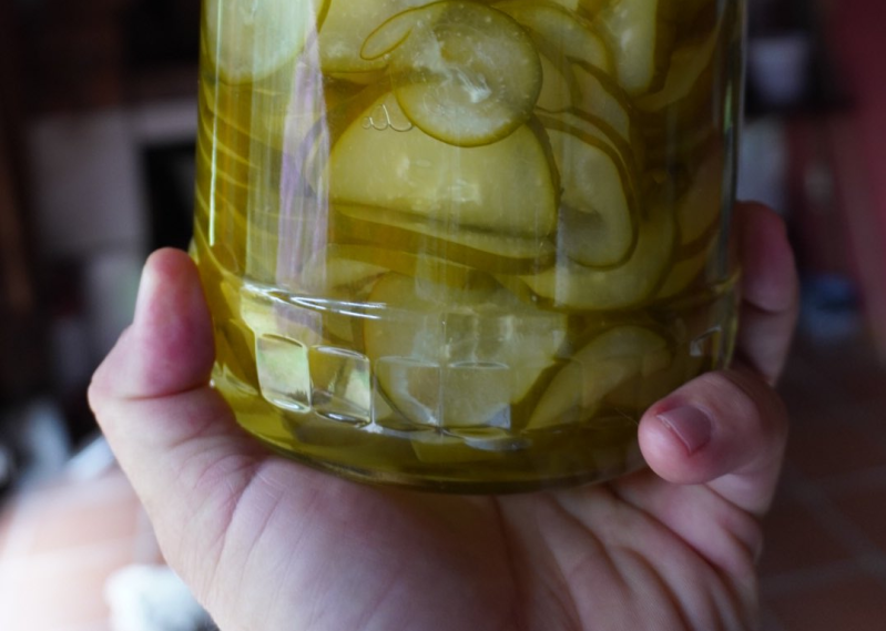 “Ponés 1lt de vinagre blanco y 500gr de azúcar a hervir. Mientras cortás cuatro pepinos lavados en rodajas de 2/3mm”, empezó explicando.