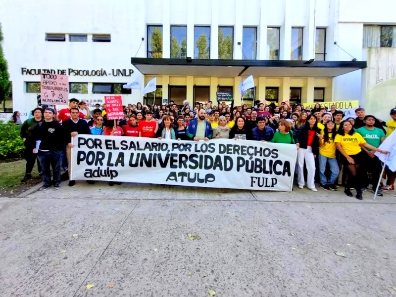 La concentración ocurrió en las escalinatas de la entrada principal de la Facultad de Psicología de calle 122 y 52. Los centros de estudiantes habían invitado a la comunidad universitaria a "defender la educación pública".