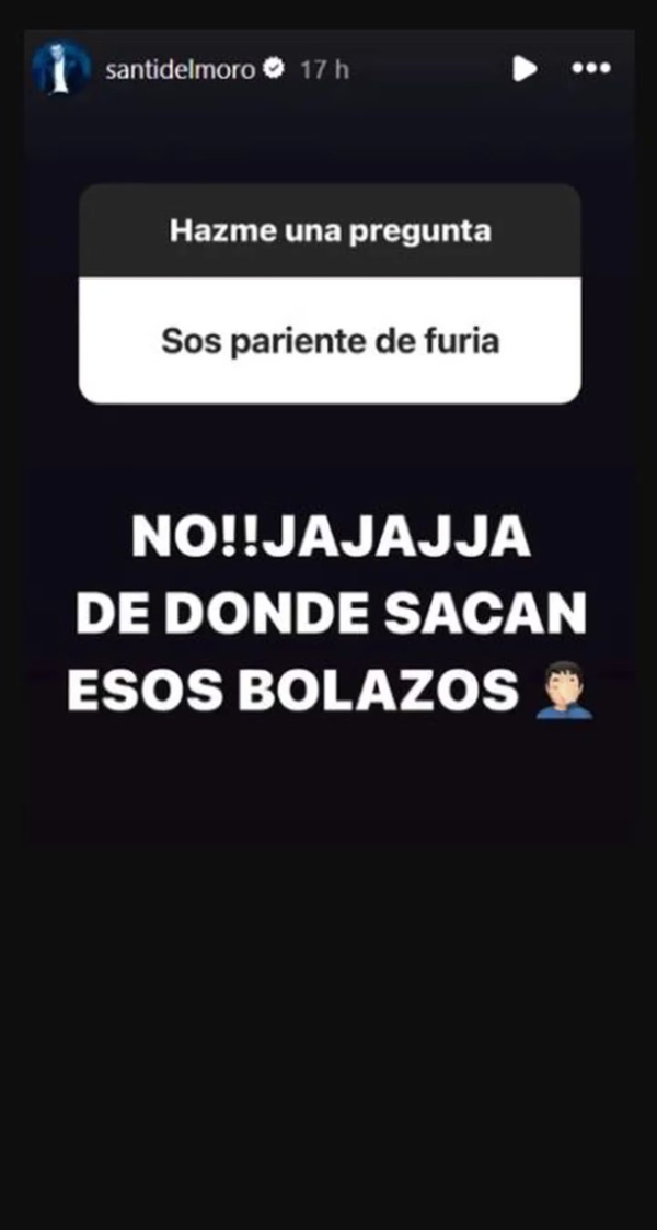 Este rumor llegó a oídos del presentador quien, por medio de sus redes sociales, decidió aclarar términos. En una dinámica de preguntas y respuestas en Instagram, que tuvo al reality como tema principal, un seguidor se animó a consultarle sobre su “parentesco” con la participante. “¿Sos pariente de Furia?”, preguntó la persona, cuestión a la que el conductor respondió: “No jajaja. ¿De dónde sacan esos bolazos?”.