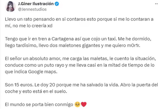 La secuencia de eventos comenzó cuando Giner, en un apremiante esfuerzo por alcanzar su tren hacia Cartagena, decidió tomar un taxi, dado que se encontraba significativamente atrasada debido a que se había quedado dormida. La narración de Jen detalla cómo, pese a enfrentarse al desafío de viajar con “dos valijas gigantes” y el tiempo en su contra, la respuesta del conductor del taxi a su situación resultó ser inesperadamente positiva.