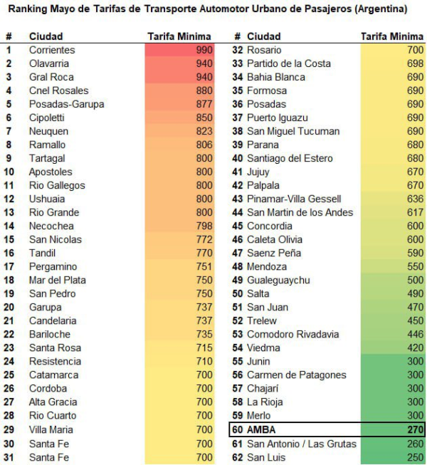 La asociación que reúne a las cámaras empresarios de micros publicó la actualización del ranking de las tarifas en todo el país.