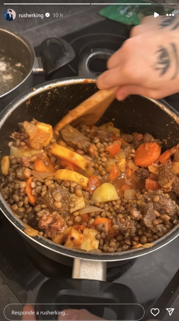 Rusherking, expareja de China Suárez, posteó una imagen que muestra la mano de Ángela -por su característico tatuaje- revolviendo un guiso, ideal para afrontar el invierno. La hija de Gloria Carrá le preparó a su novio un plato conformado por lentejas, papa, zanahoria, cebolla, carne y salsa roja. ¡A pleno!