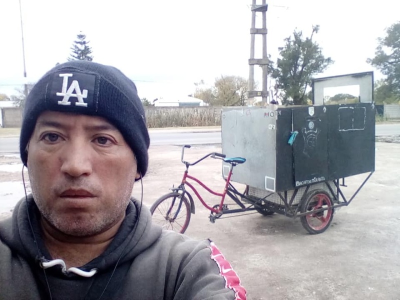 El platense "del carrito" va adonde sea con la bicicleta: hasta capital, zona sur, o a cualquier lugar que lo necesite. Lo cierto es que busca juntar plata "para comprar cubiertas, cámaras nuevas y cosas que me hacen falta para el viaje".