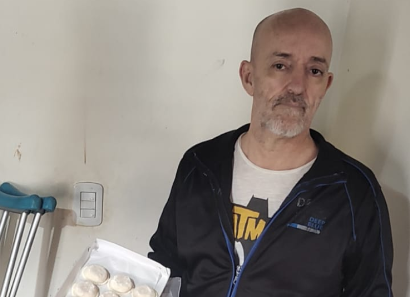 “Se me ocurrió emprender con las pastas porque tengo un problema en la pierna. Ya tuve cuatro cirugías”, revela Sergio, que ahora tiene 57 años. Pero se trata de un problema de larga data: arrancó a los 34 y todavía lamenta el abuso que hizo de los corticoides. Ahora va por una quinta cirugía en el Hospital El Cruce de Florencio Varela.