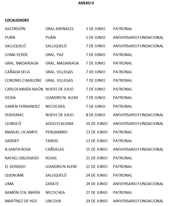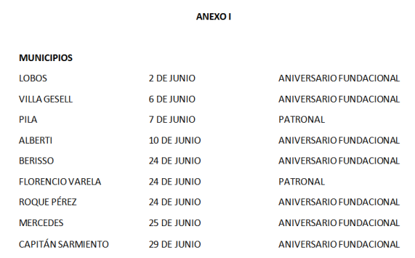 “Declarar no laborables, para la Administración Pública y el Banco de la Provincia de Buenos Aires, y feriados optativos para la industria, el comercio y restantes actividades, los días en los cuales se desarrollen festividades, en los distintos Municipios correspondientes al mes de junio de 2024, conforme se detalla en el Anexo Único que forma parte del presente”, se detalla en la resolución.