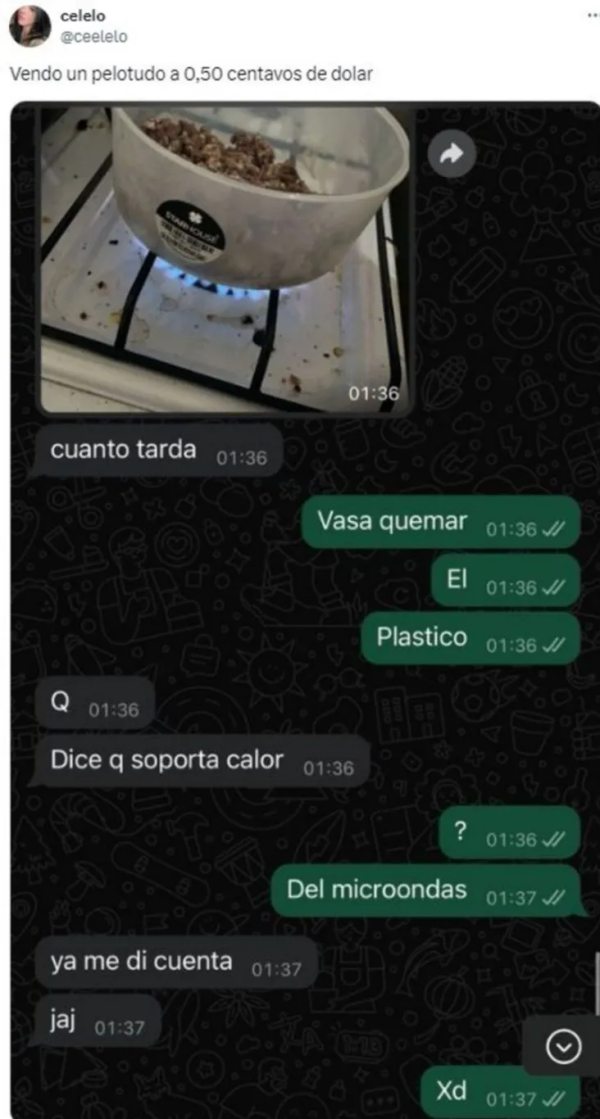 “Vendo un pelot… a 0,50 centavos de dólar”, fue el encabezado que acompañó la imagen que compartió la usuaria. Tal como se ve en la captura del chat, el novio de la joven le envió una foto en la que aparecía un recipiente plástico con carne picada congelada dentro, pero en vez de colocar el bowl para descongelar la carne en el microondas, el chico lo puso directamente en el fuego de la hornalla. “¿Cuánto tarda?”, le preguntó el joven a su novia, sin percatarse de su error.