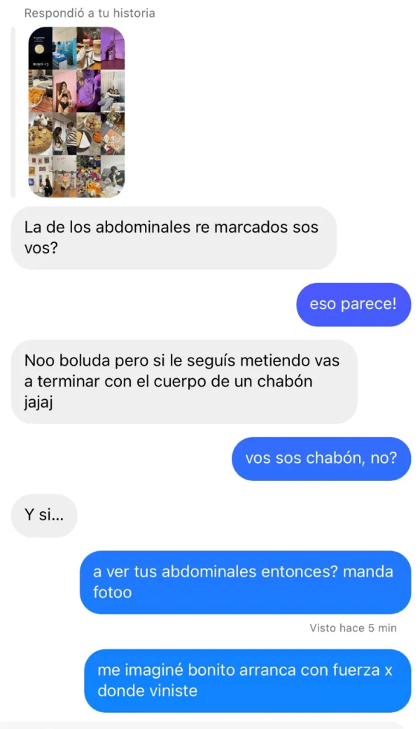 En la conversación que compartió la joven, se ve que un chico le respondió dicha historia y preguntó lo siguiente: “¿La de los abdominales re marcados sos vos?”. A lo que la joven le respondió: “Eso parece”.