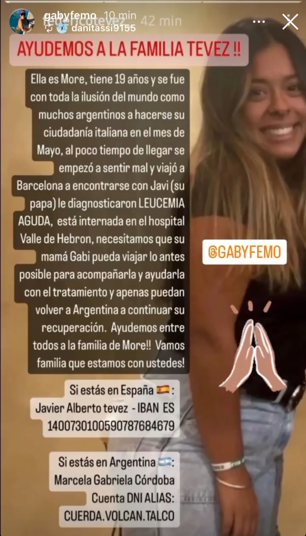 "Necesitamos que su mamá Gabi pueda viajar lo antes posible para acompañarla y ayudarla con el tratamiento y apenas puedan volver a la Argentina continuar con su recuperación. Ayudemos entre todos a la familia de More. ¡Vamos familia que estamos con ustedes!", dice la publicación que se viralizó en redes sociales. Para colaborar, desde España, el IBAN es 1400730100590787684679. En nuestro país la colaboración se puede hacer al alias CUERDA.VOLCAN.TALCO.