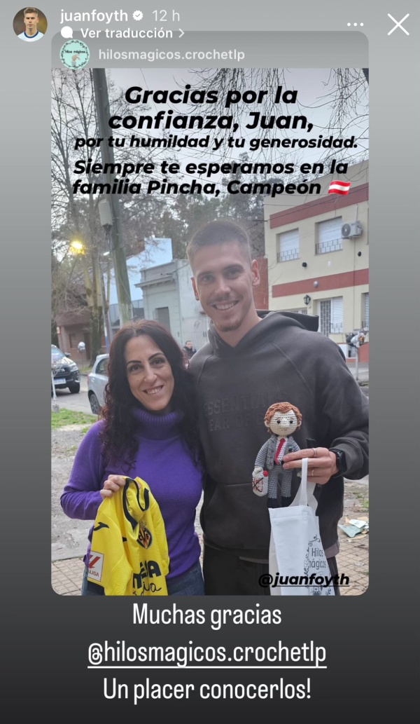 En este contexto, tuvo un buen gesto con una emprendedora y adquirió un objeto que ratifica su ADN Pincharrata. "Muchas gracias Hilosmagicos.crochetlp. Un placer conocerlos", dedicó el jugador, posando orgulloso con su Doctor Bilardo en miniatura, tejido en ese material. El muñeco recrea el traje típico que supo lucir el "Narigón" durante el mundial de México 1986 y está acompañado por el famoso Bidón, que quedó inmortalizado en Italia 1990.