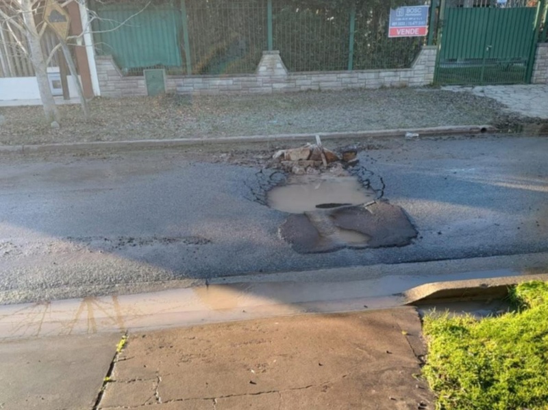 Es que, para colmo, una gran pérdida provoca que el asfalto se rompa cada vez más e incluso el cráter se llenó de agua.
