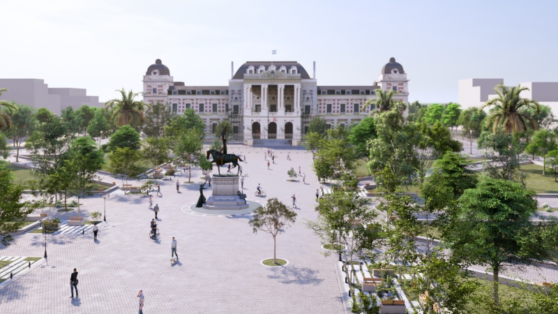 La revalorización de la plaza demandará un plazo de 6 meses y propone recuperar su valor institucional. Como parte de la propuesta, se contempla el reemplazo del solado actual por baldosas graníticas, manteniendo el lenguaje propio del eje fundacional y garantizando la unidad visual, y la creación de un Paseo del Arte y las Esculturas frente al Pasaje Dardo Rocha, vinculándolo con el espacio abierto de exposiciones del MACLA.