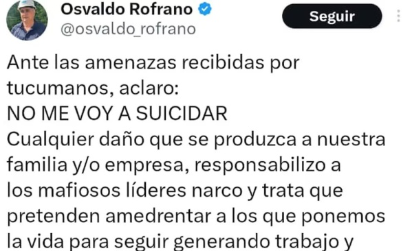 Hace algunos días, el emprendedor había denunciado ser víctima de amenazas por medio de una publicación en la red social X. “Ante las amenazas recibidas por tucumanos, aclaro: no me voy a suicidar”.