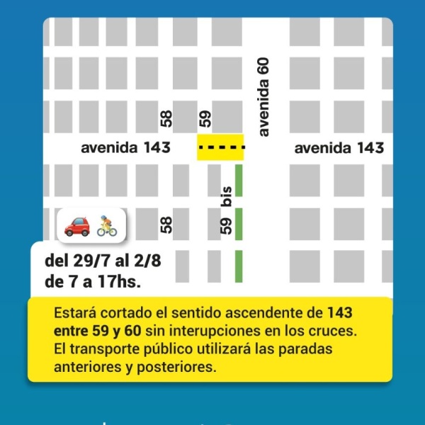 La Municipalidad informó que, por avances en trabajos de pavimentación, del lunes 29 de julio al viernes 2 de agosto se procederá al corte del sentido ascendente de 143 entre 59 y 60 sin interrupción de cruces
