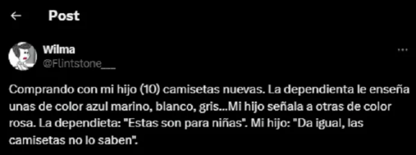La usuaria de X @Flintstone___ contó en aquella red social que fue con su hijo a un local de ropa para comprarle algunas prendas. Una vez que estuvieron en la tienda, una vendedora intentó guiar al niño hacia camisetas de color azul marino, blanco y gris, pero el niño mostró interés en las camisetas rosas. La empleada entonces le dijo que esas camisetas eran para niñas, provocando una respuesta que abrió el debate en las redes sociales.