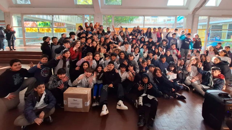 El cantante se acercó a la Escuela Nº 8 Carlos Della Penna, donde él estudió cuando era chico, y se fotografió juntos a los niños levantando las manos en señal de alegría.