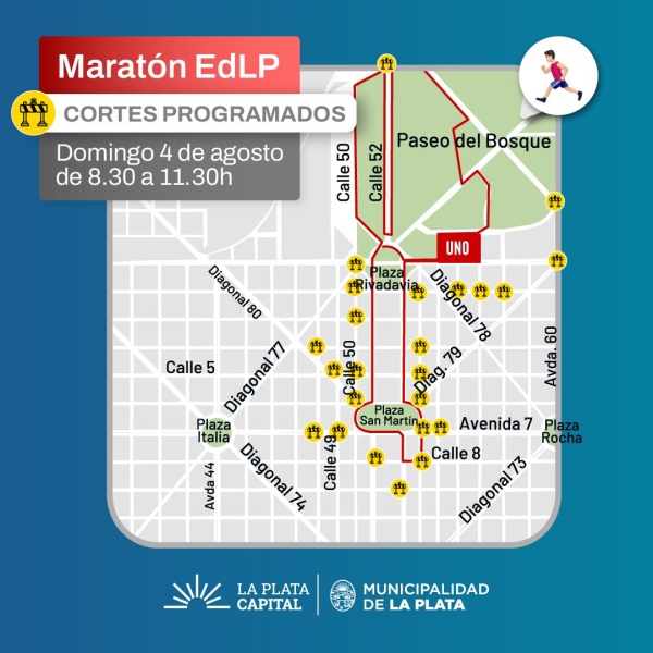 En función del recorrido de la maratón del “pincha”, también se verá interrumpido el tránsito en los cruces de avenida 7 con las calles 48, 49, 55 y 56 y de calle 8 con 51 y 54; las esquinas de calle 9 y 53, calle 6 y 55, diagonal 79 y 54 y calle 4 y 54; los cruces de la calle 2 con diagonal 78, calles 54, 56, 57, 58, avenida 60 y calle 61; y la esquina de avenida 60 y 116.