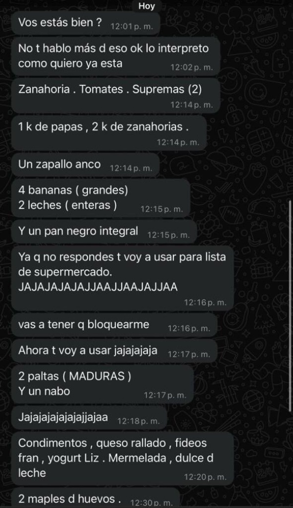 La joven, lejos de dejarse abatir por la situación, comenzó a utilizar el chat como un anotador personal, informando al chico que lo emplearía para su lista del supermercado. “Ya que no respondés te voy a usar para la lista del supermercado. Vas a tener que bloquearme”, escribió, seguido de un detalle de ítems: “zanahorias, tomates, supremas, zapallo anco, leches”.