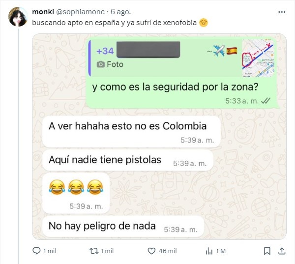 Indignada, la usuaria publicó la captura de pantalla en su perfil junto con la frase: “Buscando apartamento en España y ya sufrí xenofobia”, acompañada de un emoji de carita triste.