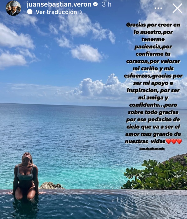 "Gracias por creer en lo nuestro, por tenerme paciencia, por confiarme tu corazón, por valorar mi cariño y mis esfuerzos, gracias por ser mi apoyo e inspiración, por ser mi amiga y confidente... pero sobre todo gracias por ese pedacito de cielo que va a ser el amor más grande de nuestras vidas", le dedicó la "Brujita", en una historia de su cuenta que publicó bien temprano.