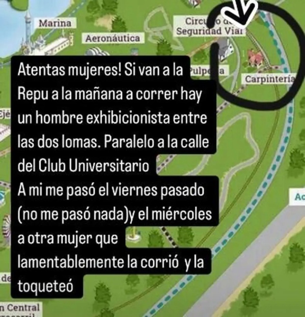 Según se denunció en redes sociales, el pervertido atacá en horas de la mañana y suele meterse en la parte de la puerta que da a la carpintería donde muchas personas salen a correr. Precisamente en las mediaciones con el Club Universitario. Por este motivo se multiplicó la presencia policial en la zona, hay mujeres y vecinos alertas por el tema.