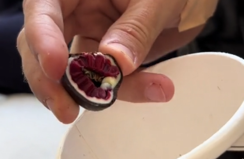 Un joven compró frambuesas bañadas en chocolate y descubrió algo desagradable al abrir una por la mitad. Su novia sacó el celular y decidió filmar la repugnante situación que se hizo viral en TikTok.