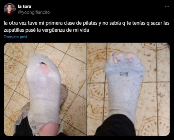 Una usuaria de X (ex Twitter) contó en su perfil que fue a su primera clase de pilates pero hubo un detalle que no tuvo en cuenta que le hizo pasar la vergüenza de su vida. Según contó, ella no sabía que para realizar los ejercicios tenía que sacarse las zapatillas, por lo que decidió ir con medias viejas y rotas.