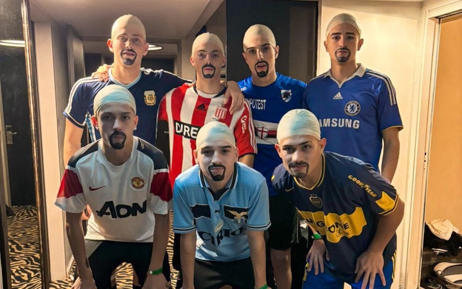 Como no podía ser de otra manera, también se pusieron gorros de natación. Una vez completaron esos pasos, empezaron a circular las camisetas del Manchester United, Lazio, Estudiantes, Boca, Sampdoria, Chelsea y la Selección Argentina. Solo así, formaron como un equipo.