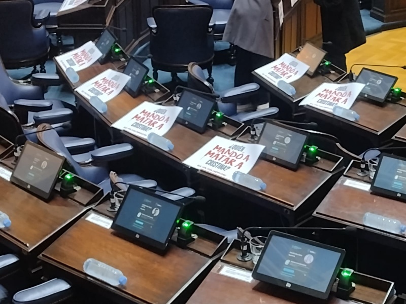 Hacía las 14 horas comenzaron a ingresar asesores de Unión por la Patria a desplegar los cartelitos que coparían las bancas peronistas: "¿Quién mandó a matar a Cristina?".