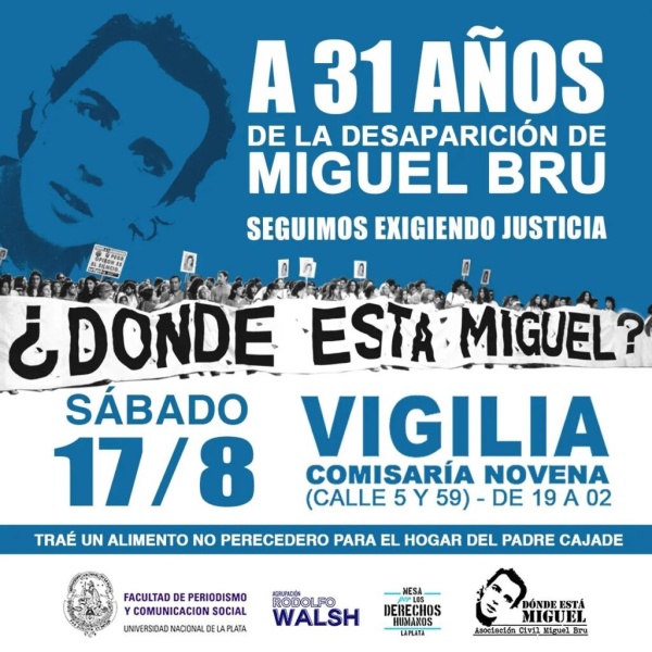 Este sábado 17 se realizará una nueva vigilia frente a la Comisaría 9ª de la ciudad de La Plata para reclamar justicia por Miguel Bru, el estudiante de la entonces Facultad Superior de Periodismo y Comunicación Social de la Universidad Nacional de La Plata (UNLP), desaparecido y torturado hasta morir en 1993 en ese mismo lugar.