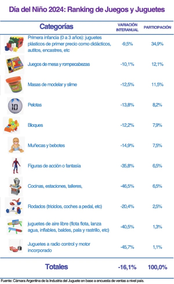 También detallaron que en jugueterías de barrio, ''el ticket promedio rondó los $9.000 por unidad; mientras que las cadenas de jugueterías, con un 90% de productos importados, el ticket promedio por juguete fue de $25.000'', destacando que el desempeño de las segundas en cuanto a ventas fue mejor, ya que representó una caída de apenas el 3%, frente a un 19% de las barriales o clásicas.