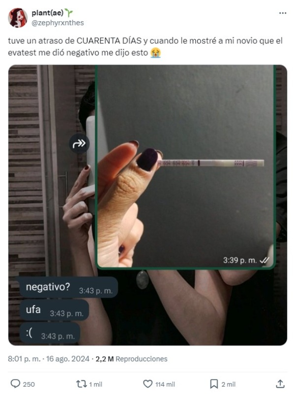Junto a la imagen, la joven escribió: “Tuve un atraso de CUARENTA DÍAS y cuando le mostré a mi novio que el test me dio negativo me dijo esto”, seguido de un emoji de una carita llorando.