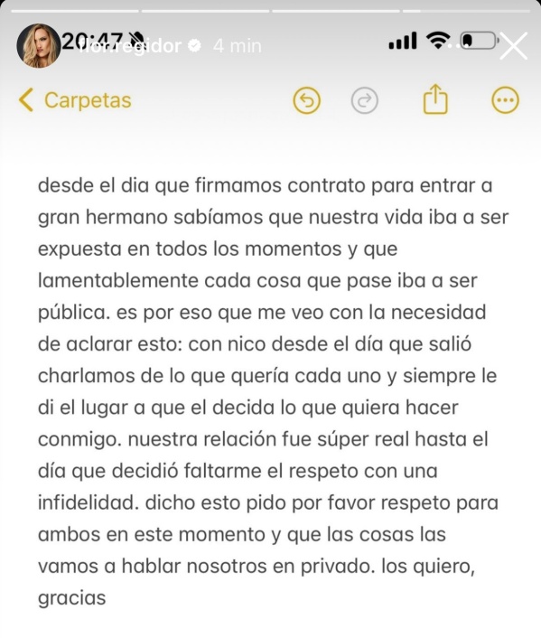 Fue la propia Flor Regidor que en un posteo confirmó la separación porque Nico le faltó el respeto.