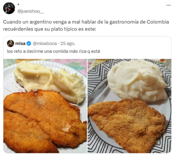 La controversia comenzó cuando Juan compartió una foto de una milanesa con puré acompañada del comentario: “Cuando un argentino venga a hablar mal de la gastronomía de Colombia recuérdenle que su plato típico es este”. El comentario generó rápidamente una fuerte reacción de los usuarios argentinos.