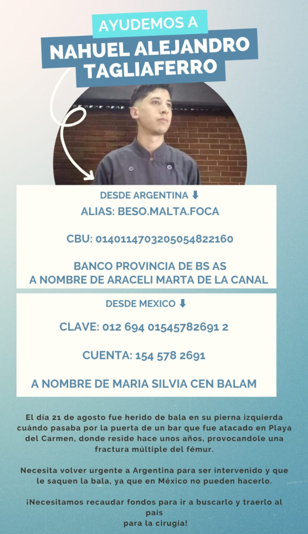 “Cuando nos comunicamos con el consulado argentino en Playa del Carmen, les contamos esto y nos señalaron que bajo ningún concepto se va a hacer un avión sanitario. Es increíble. Los sicarios lo tirotean y el consulado ni siquiera es capaz de conseguir algo. Nos exigen que vaya alguien a buscarlo, y el avión tiene que ser de primera clase y de Aerolíneas Argentinas porque es el único vuelo directo. La realidad es que se desligaron y nosotros estamos desesperados”, profundizó.