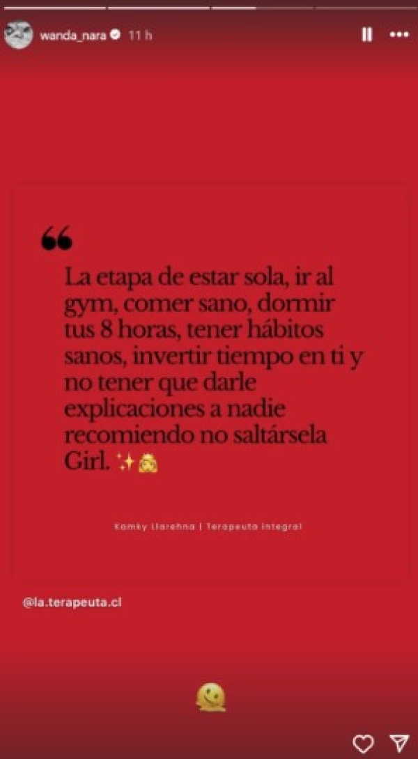 “La etapa de estar sola, ir al gym, comer sano, dormir tus 8 horas, tener hábitos sanos, invertir tiempo en ti y no tener que darle explicaciones a nadie, recomiendo no saltársela”, sentenció, junto al emoji que está derritiéndose.