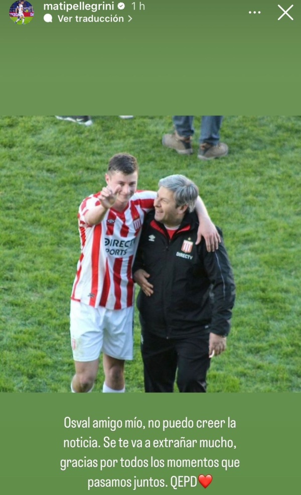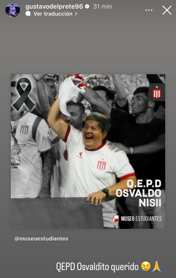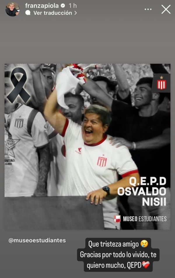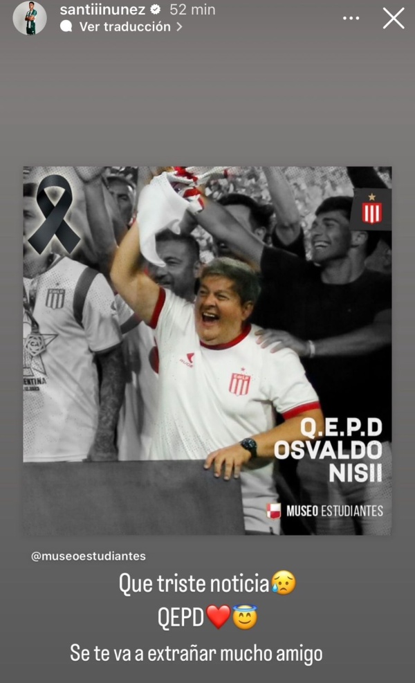 "QEPD Osvaldito querido", afirmó por otra parte Gustavo del Prete, y finalmente, entre tantísimas publicaciones, un consternado Matías Pellegrini lo despidió de la siguiente manera: "Osval amigo mío, no puedo creer la noticia. Se te va a extrañar mucho, gracias por todos los momentos que pasamos juntos". Sin dudas que Nisi fue una persona muy querida en la vida de Estudiantes y hoy quedó de manifiesto.