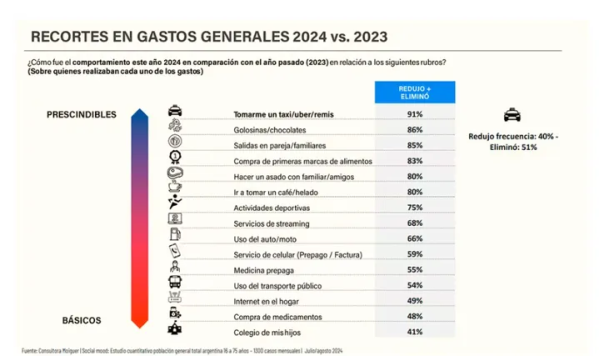 Pero más allá de que sea uno de los gastos más reducidos, no es el que más sufrió. Según los datos relevados por Moguier, el consumo que más fuertemente regularon los encuestados fue el de taxi, uber o remis. El 51% de los encuestados eliminó el recurso a ese tipo de servicios mientras que el 40% tuvo que disminuirlo.