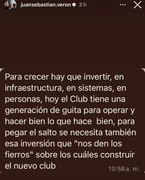 Y en medio de esto, por una tercera vía y lejos de encasillarse en un sector, Verón volvió a elegir el camino de las redes sociales para expresar cuál es su idea y dejó en claro que piensa seguir avanzando con el modelo de sociedad mixta. "Para crecer hay que invertir. En infraestructura, en sistemas, en personas. Hoy el club tiene una generación de guita para operar y hacer bien lo que hace bien. Para pegar el salto se necesita también esa inversión que nos den los fierros sobre los cuales construir el nuevo club", afirmó.
