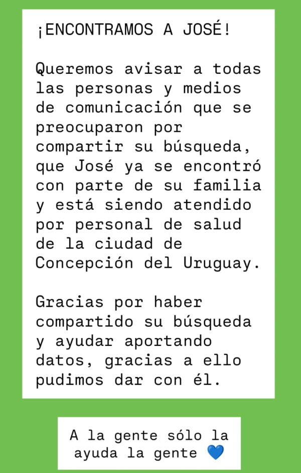 José Luis Torres fue finalmente localizado en Entre Ríos. Su familia reportó que está siendo atendido por personal de salud en Concepción del Uruguay.