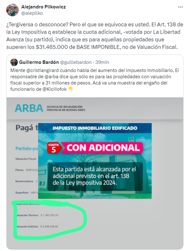 “¿Tergiversa o desconoce? Pero el que se equivoca es usted. El Art. 138 de la Ley Impositiva q establece la cuota adicional, -votada por La Libertad Avanza (su partido), indica que es para aquellas propiedades que superen los $31.465.000 de BASE IMPONIBLE, no de Valuación Fiscal”, le explicó el vocero de ARBA.