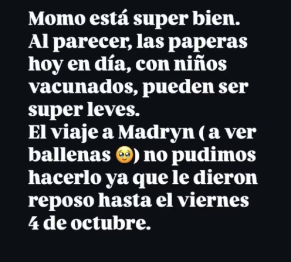 “Momo está muy bien. Al parecer, las paperas hoy en día, con los niños vacunados, pueden ser muy leves. El viaje a Puerto Madryn no pudimos hacerlo, ya que le dieron reposo hasta el viernes 4 de octubre”, explicó a través de sus historias de Instagram.