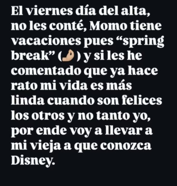 “El viernes, día del alta, Momo tiene vacaciones, pues spring break. Ya hace rato mi vida es más linda cuando son felices los otros y no tanto yo, por ende voy a llevar a mi vieja a que conozca Disney”, reveló, emocionada.