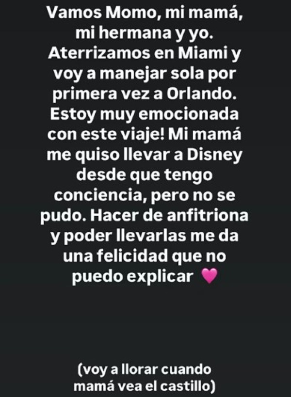 “Aterrizamos en Miami y voy a manejar sola por primera vez a Orlando. ¡Estoy muy emocionada con este viaje! Mi mamá me quiso llevar a Disney desde que tengo conciencia, pero no se pudo. Hacer de anfitriona y poder llevarlas me da una felicidad que no puedo explicar. Voy a llorar cuando ella vea el castillo”, sentenció, muy dulce.