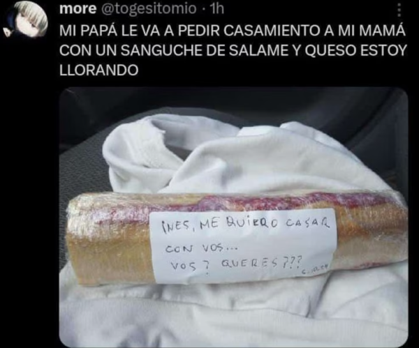 La publicación no tardó en viralizarse por la sencilla pero ingeniosa propuesta. “Mi papá le va a pedir casamiento a mi mamá con un sánguche de salame y queso. Estoy llorando”, escribió la joven junto a la imagen del peculiar sándwich.