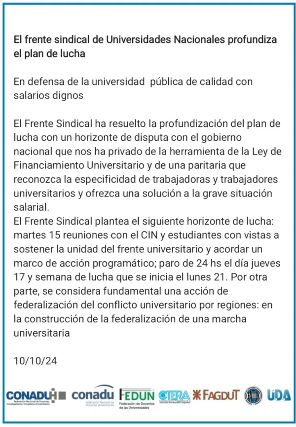 Además del paro nacional del 17 de octubre, el Frente Sindical convocó a una semana de lucha a partir del lunes 21. Antes, planean realizar una reunión el martes próximo con las autoridades agrupadas en el Consejo Interuniversitario Nacional (CIN) y los Centros de Estudiantes de todo el país para "sostener la unidad del frente universitario y acordar un marco de acción programático".