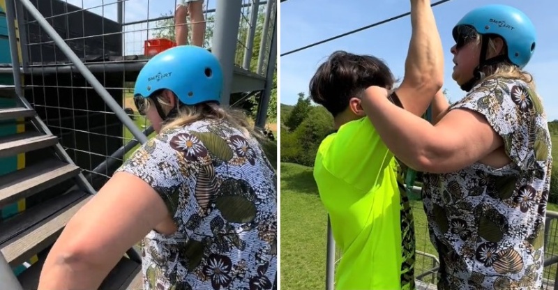 A medida que transcurrían los minutos, la transformación se hizo evidente. Lo que comenzó como una situación llena de angustia y miedo, se convirtió en un momento de valentía cuando la mujer, poco a poco, se soltó de la plataforma. Sus pies colgaban en el aire, ya que estaba sostenida únicamente por las cuerdas de la tirolesa. En un instante crucial, tomó impulso y, sin mirar atrás, atravesó el trayecto a gran velocidad, superando el agua que se encontraba debajo y llegando al otro lado de manera segura.