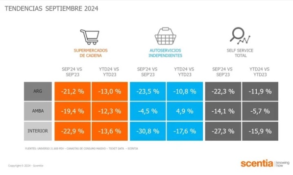 Los supermercados retrocedieron 21,2% y autoservicios 23,5%, según la medición de la consultora Scentia, con el atenuante de bases de comparación positivas en ambos casos. Esta contracción en las ventas es común a todas las canastas y sin grandes diferencias entre canales.