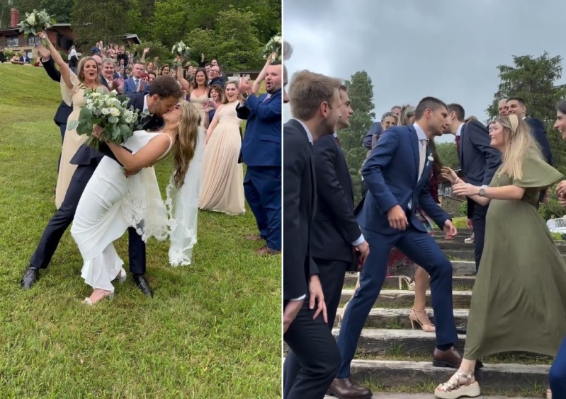 Durante la celebración, todos los invitados formaron una fila que se movía al ritmo de la música. Cada pareja se detenía frente a la otra para compartir un beso, mientras que los invitados solteros no quedaron fuera del espectáculo, participando al chocar hombros, puños o dándose besos en la mejilla.