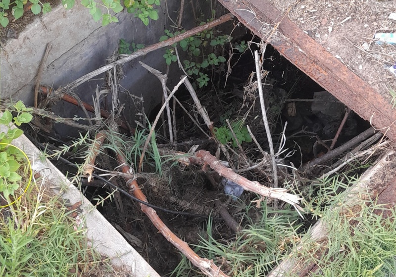 A tan solo una cuadra, en 69 y 120, existe otro pozo en plena vereda. Este fue mayormente cubierto, pero no en su totalidad.